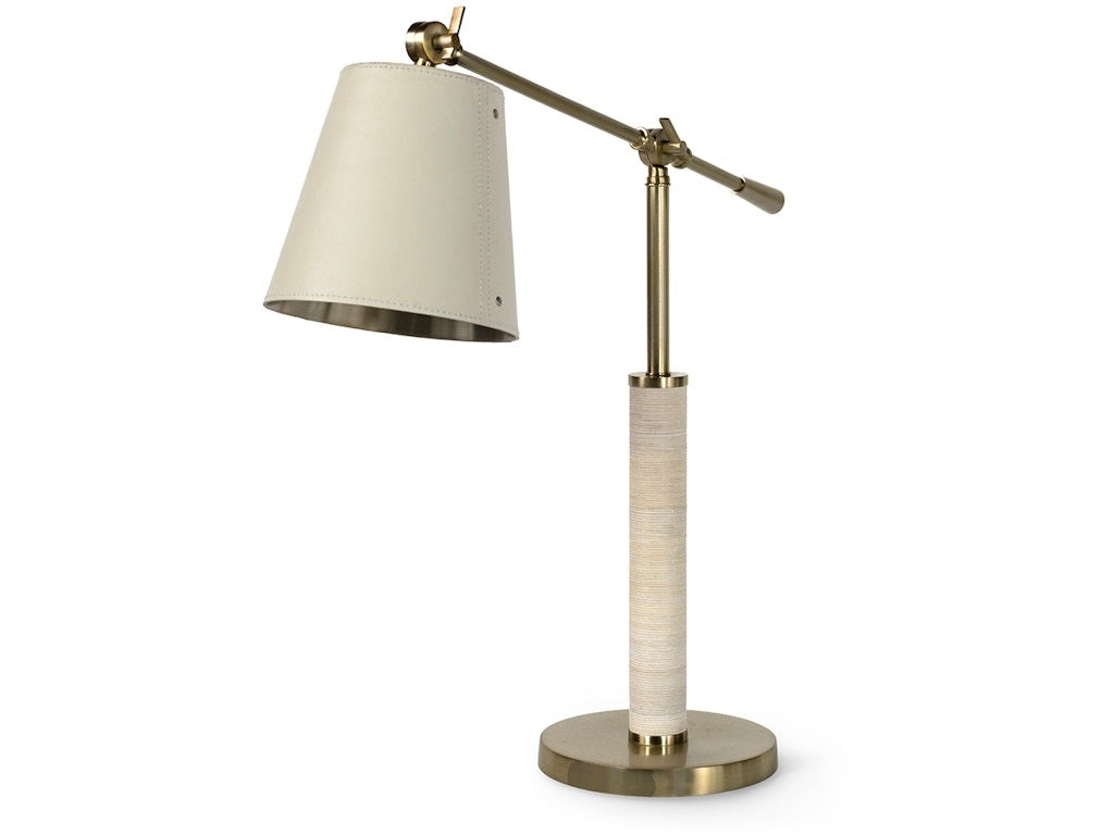 Hand-stitched cream leather wrapped over a metal shade complemented with coiled bleached rattan details and champagne finished brass body and base. Lamp is vertically adjustable. Coordinates with the Hendrick cream collection.SKU:2749-41 OVERALL DIMENSIONS:8"D X 23.5"DP X MIN 24.25" / MAX 30"