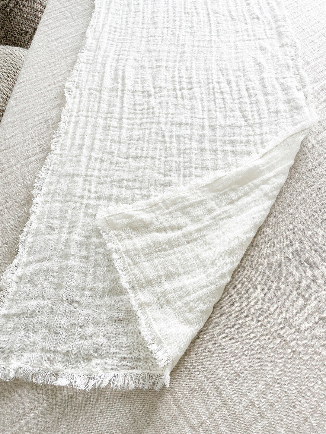 The Crinkled Doubleweave Linen Table Runner styles perfectly on a wood dining room table and is a staple for any entertaining display whether casual or formal. Each runner is finished with a self frayed edge and has a natural crinkled soft hand feel. Machine Wash.