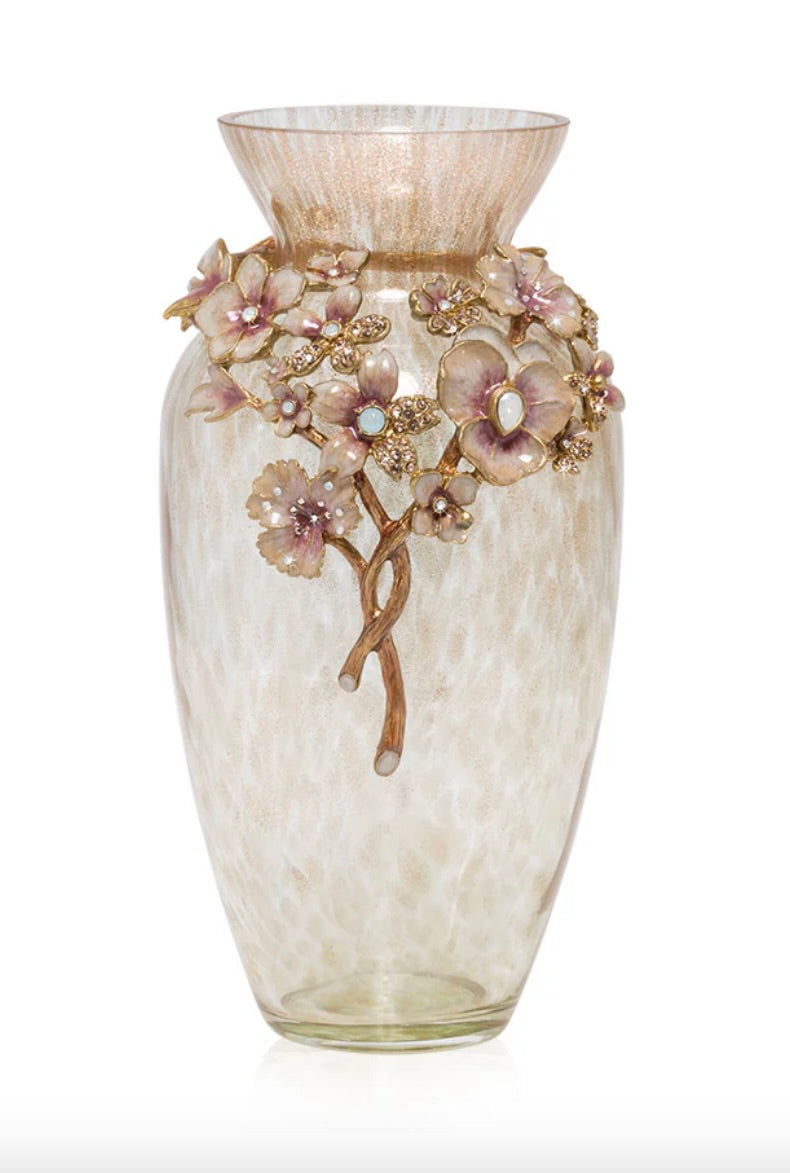 A cascading necklace of delicate jeweled blossoms wraps around the Polly Bouquet Vase. The clear glass body is mouth-blown and infused with metallic gold frit, creating a luminous, textured effect. Its floral collar is hand-enameled in the collection's signature blue and cream hues, beautifully accented with 60 hand-placed European crystals for a touch of refined sparkle. The perfect gift of love!
