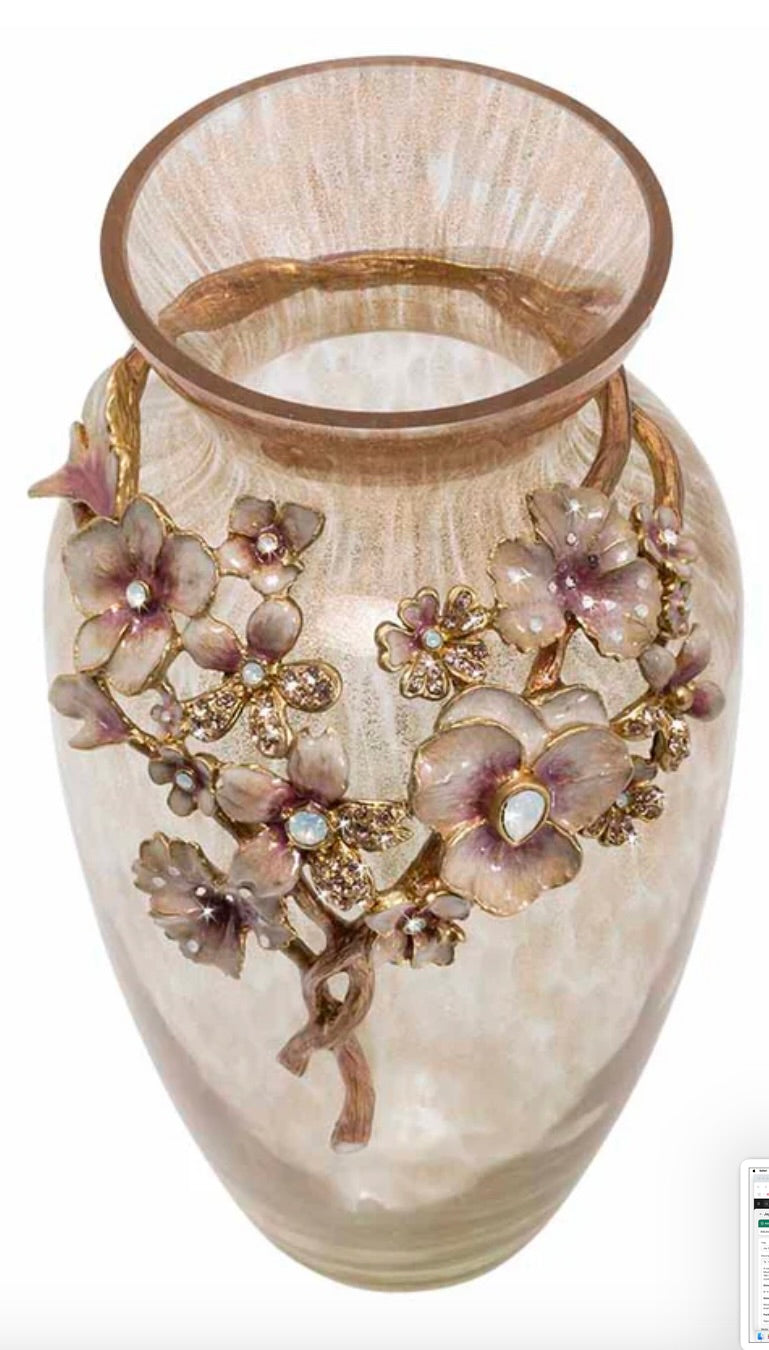 Materials: Mouth-blown gold dappled glass vase with a 18K Gold finished metal collar hand painted with enamels and hand-set with Swarovski® crystals.