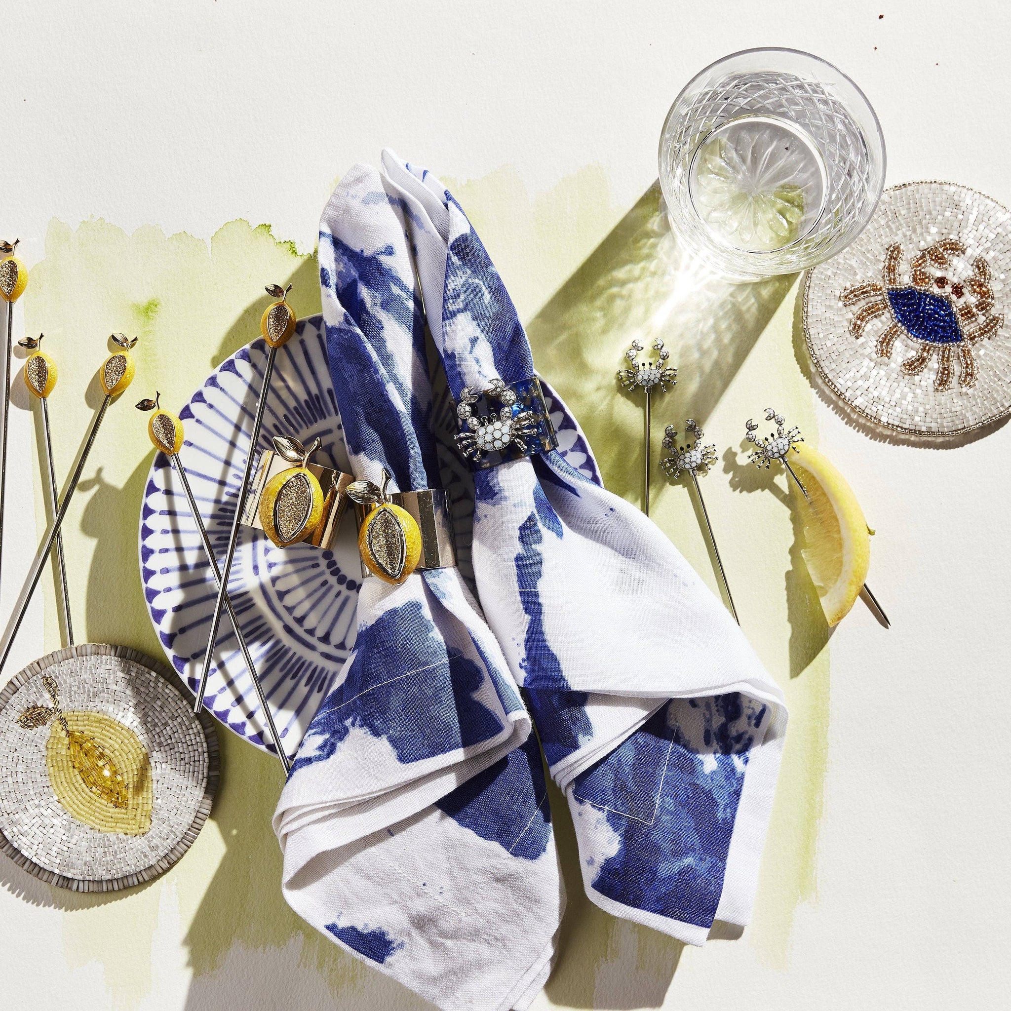 Based on our best selling crab napkin rings, we had to add some matching cocktail picks. I am already smelling the lobster and the shrimp! Food grade stainless steel, zinc and glass 4" x 0.5" x 0.5" Set of six Packaged in a gift Hand wash only