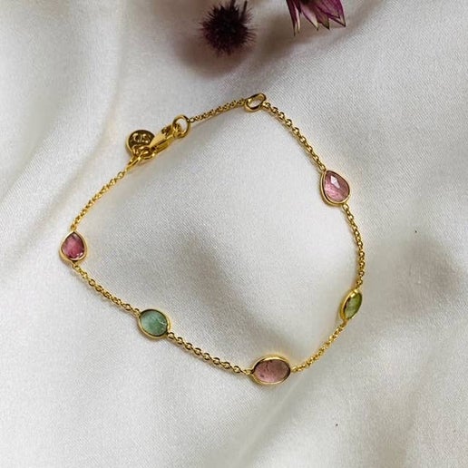 Bracelet chaine en plaqué or assortie de cinq tourmalines serties dans les tons de vert et roseDimension : 17 cm avec un anneau de rappel à 15,5 cmUn bracelet tout en finesse er raffinement