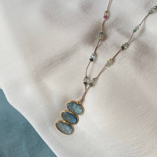 Collier sur fil lurex composé de mini pierres fines en tourmalines et labradorites réparties sur la longueur du collier , assorties d'un pendentif de trois pierres serties en kyanite bleue ou verte.Ce collier s'harmonisera parfaitement avec les bracelets Piana de la collection Baggia.Ajustable par un noeud coulissant.Longueur 65 cm